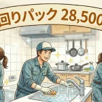 - 主な清掃箇所: シンク、排水口、ガスコンロ(IH)、レンジフード表面・フィルター、壁面タイルなど。