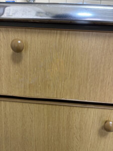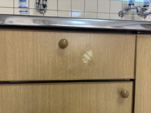 キッチンの両面テープタイプのフックを剥がした際に剥がれたようです。